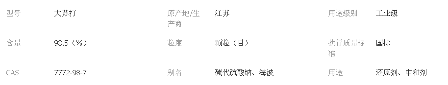 硫代硫酸鈉,又名大蘇打、海波、次亞硫酸鈉。為單斜晶系白色結晶粉末,易溶于水,不溶于醇。用于分析試劑等,用途非常廣泛。