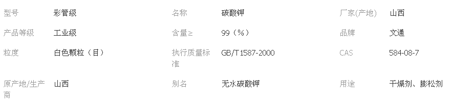 碳酸鉀,白色結晶粉末。密度2.428g/cm3。熔點891℃,溶于水,碳酸鉀水溶液呈堿性吸濕性